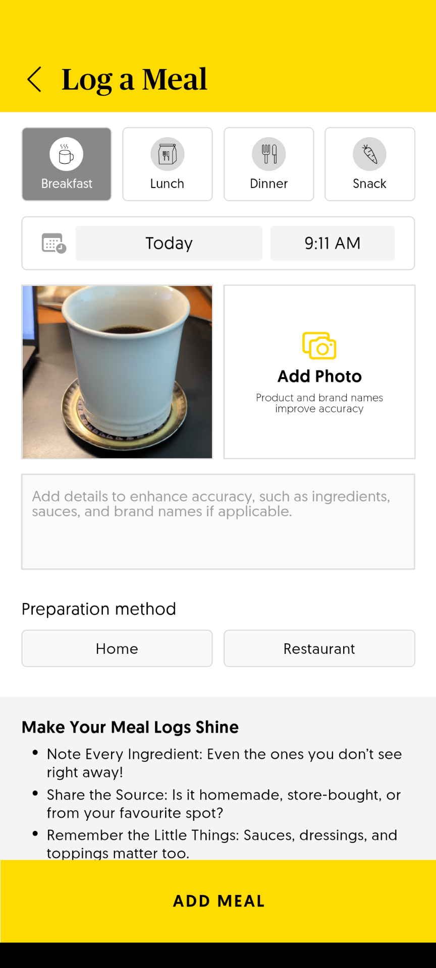 When you snap a photo of your meal, you can add a note to help our system better understand what’s in the image. This is especially useful when certain details aren't visible or when there’s more to the story than meets the lens.