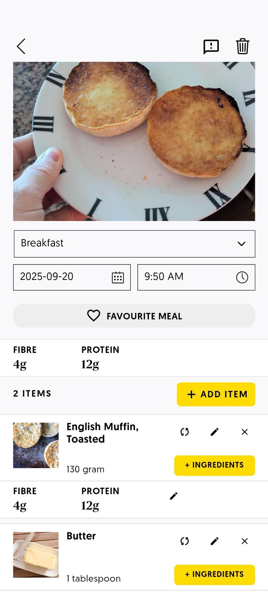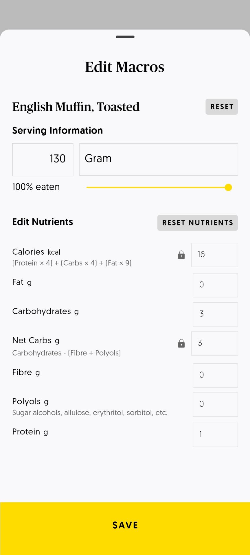 Editing macronutrients (protein, carbs, fat, and fibre) helps keep your meal log accurate.