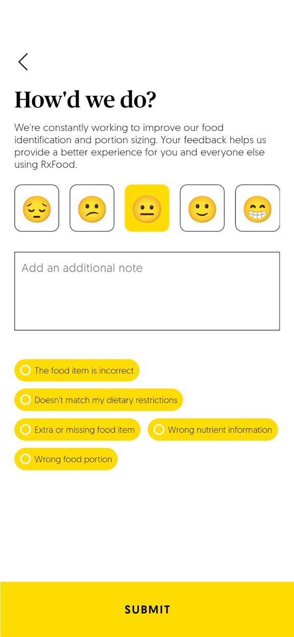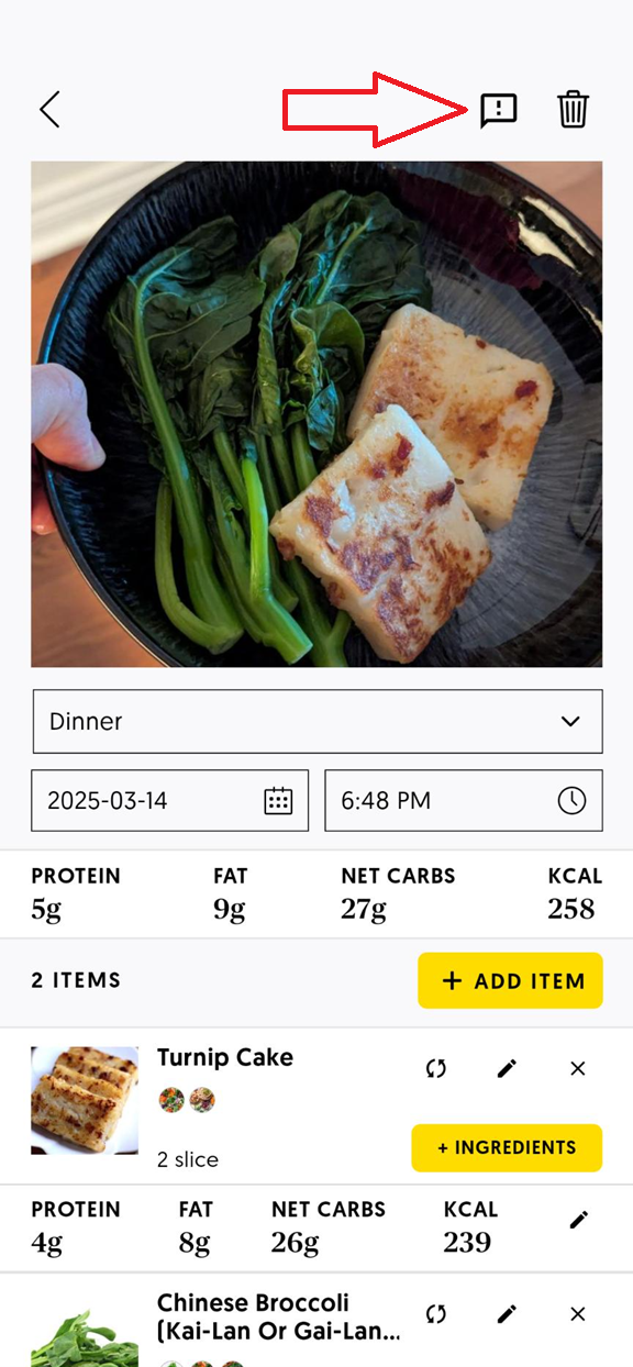 At RxFood, your feedback helps us continuously improve your experience. If something looks incorrect after logging a meal, simply tap on the meal, then tap the feedback icon (see image below).