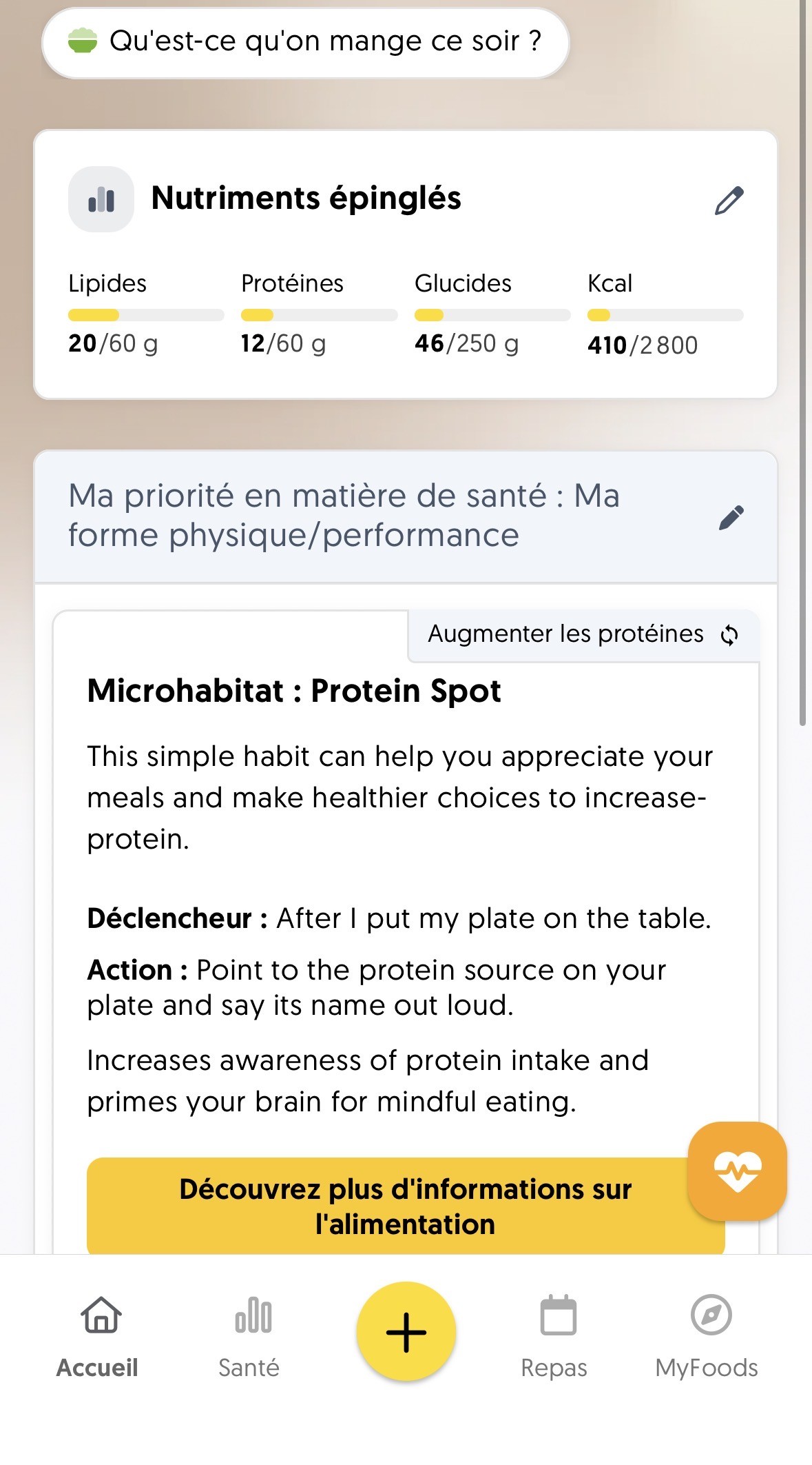 Les nutriments épinglés vous permettent de suivre rapidement ce qui compte le plus pour votre santé. Vous pouvez épingler jusqu’à quatre nutriments sur vos écrans Accueil et Santé.
