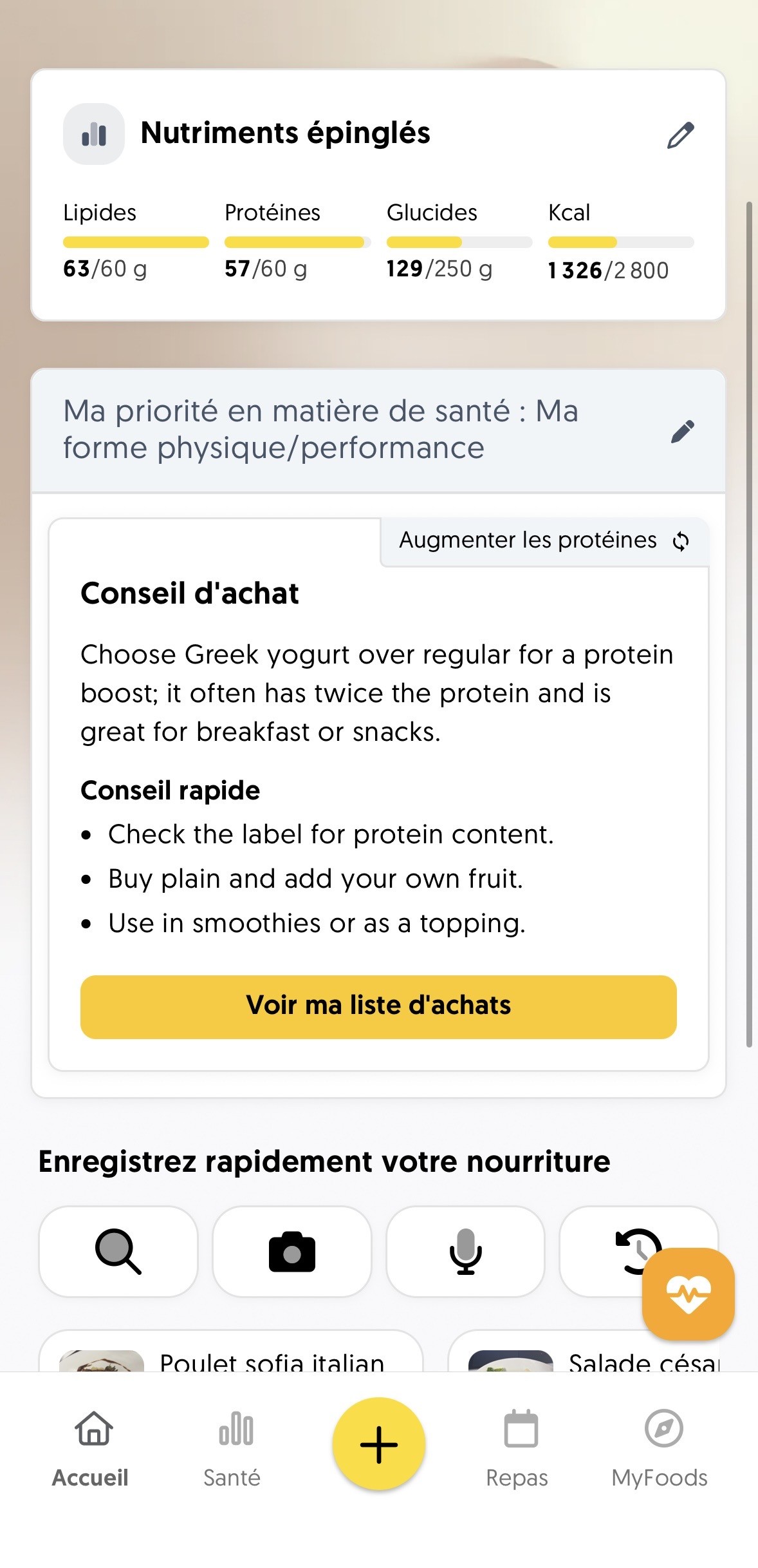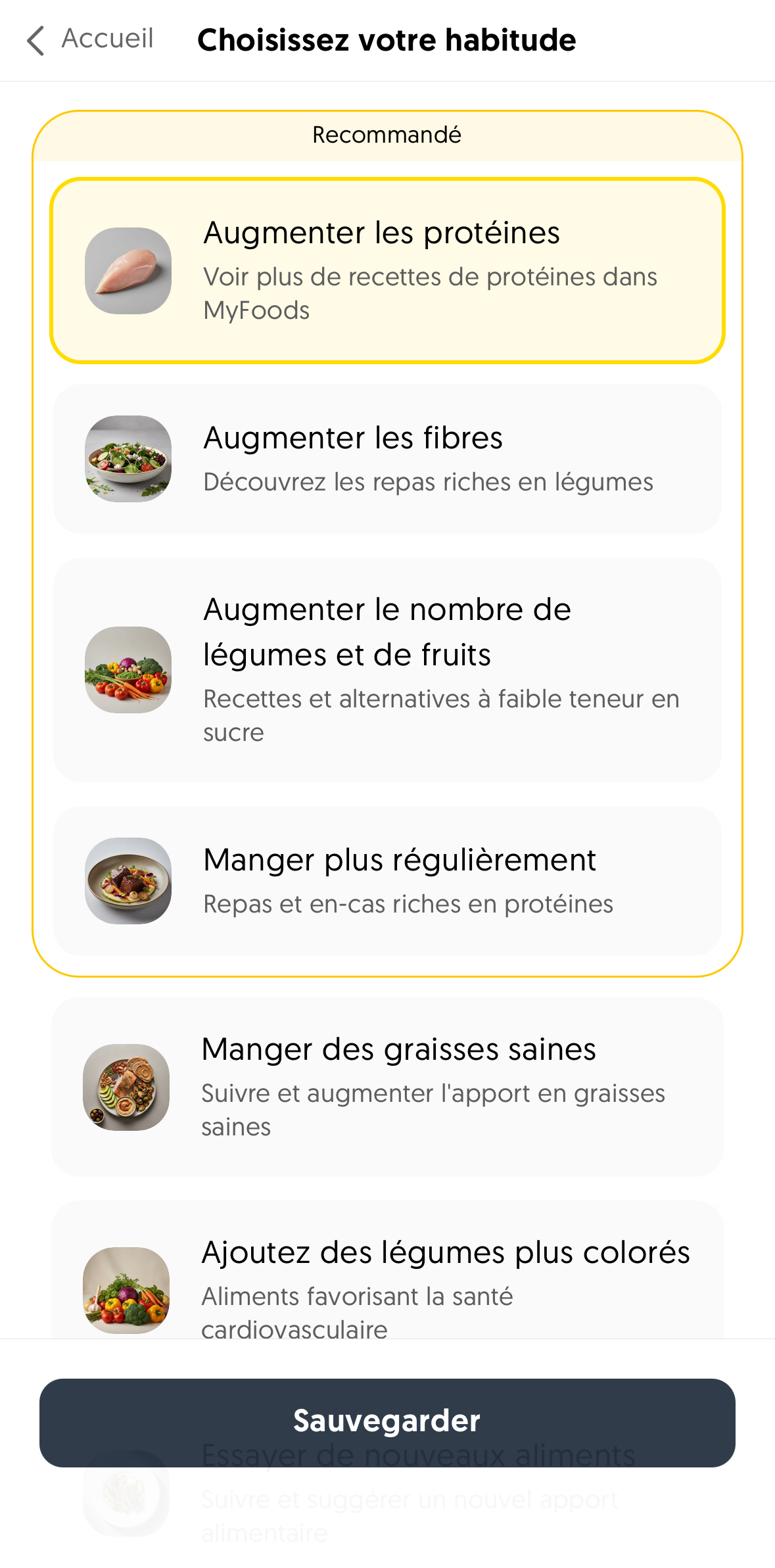 Une fois sélectionnée, RxFood vous fournira des conseils, des recommandations, des idées et des recettes pour vous aider à développer cette habitude au fil du temps. Vous pouvez échanger votre habitude en tout temps pour vous concentrer sur quelque chose de nouveau.